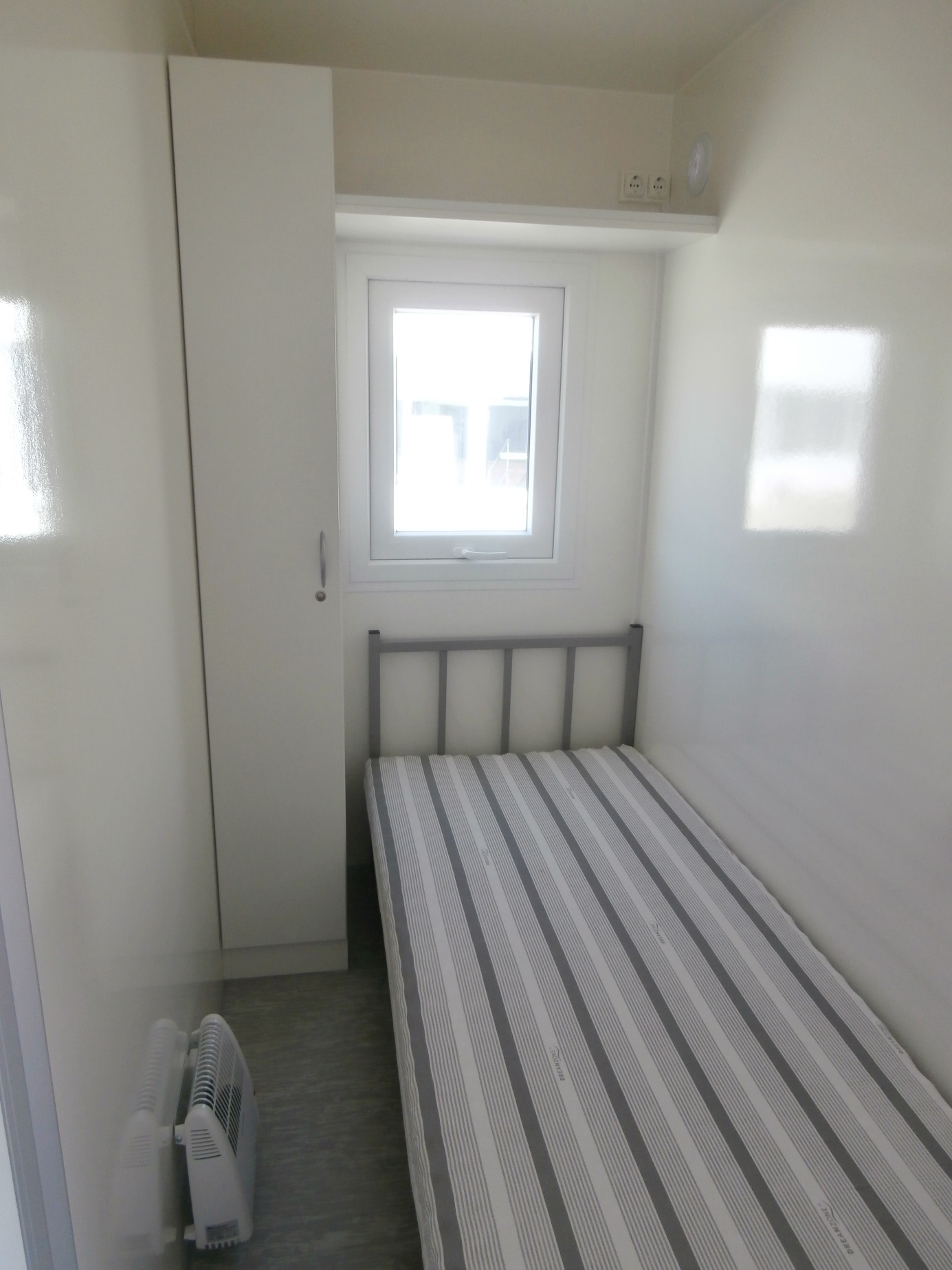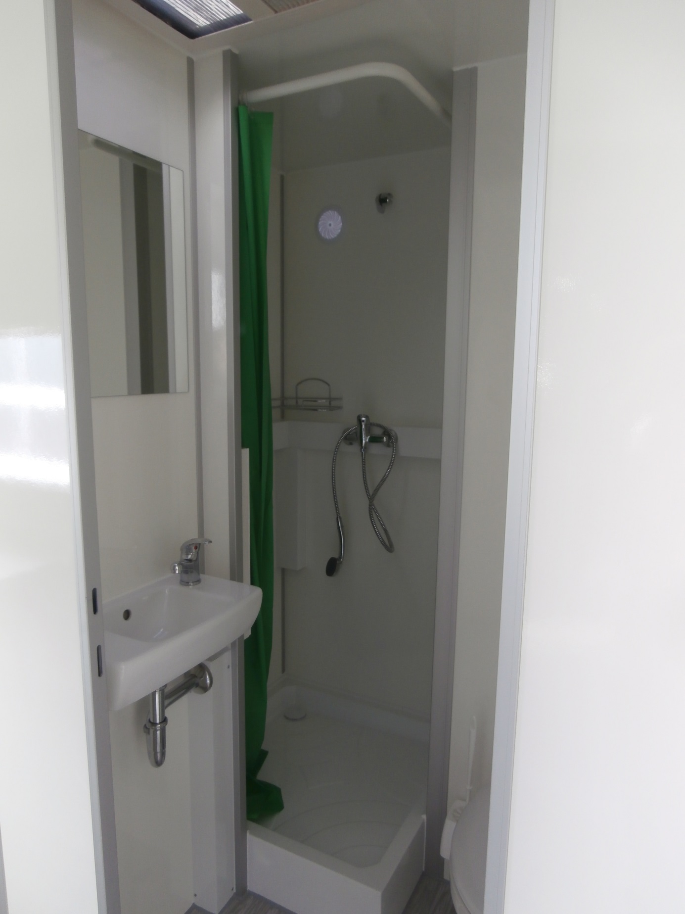 Elektrisch beheizte Wohnwagen für vier Personen, ausgestattet mit Küchenzeile, (Geschirrspülmaschine, Abzugshaube, Kochplatte, Kühlschrank, Kaffeemaschine, 19" Fernseher), 4 x Schlafzimmer mit Einzelbetten, Badezimmer mit Toilette, Dusche und Waschbecken mit Spiegel.