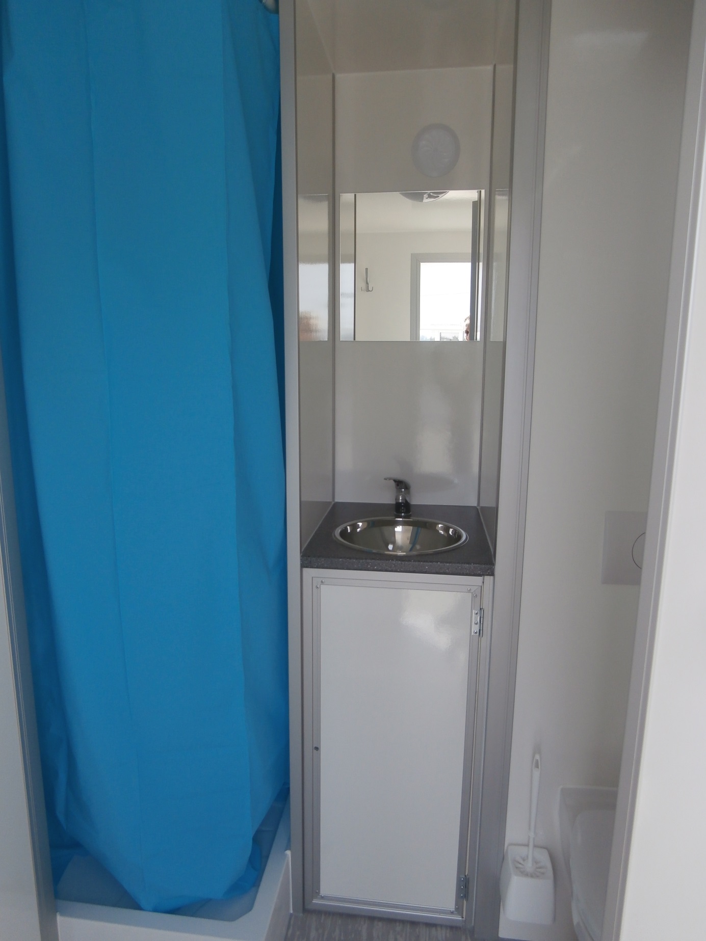Elektrisch beheizte Wohnwagen für 2-4 Personen, ausgestattet mit Küchenzeile (Geschirrspülmaschine, Abzugshaube, Kochplatte, Kühlschrank, Kaffeemaschine, 19" Fernseher), 2 x Schlafzimmer mit Stockbetten, Badezimmer mit Toilette, Dusche und Waschbecken mit Spiegel.